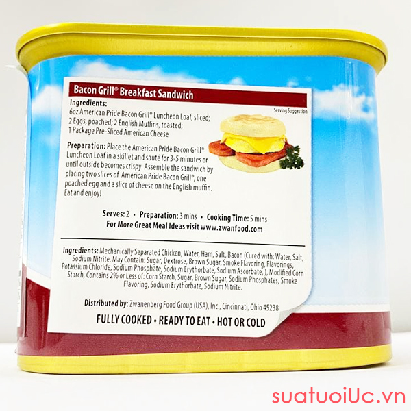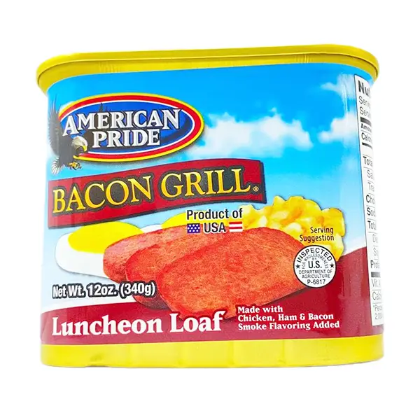 Thịt hộp American Pride Bacon Grill 340g là sản phẩm được nhập khẩu chính ngạch từ Mỹ. American Pride Bacon Grill được sản xuất trên dây chuyền hiện đại, đảm bảo giữ nguyên hương vị và giàu chất dinh dưỡng. Sử dụng sản phẩm trong các bữa ăn hàng ngày hoặc trong các chuyến du lịch, dã ngoại rất tiện lợi.