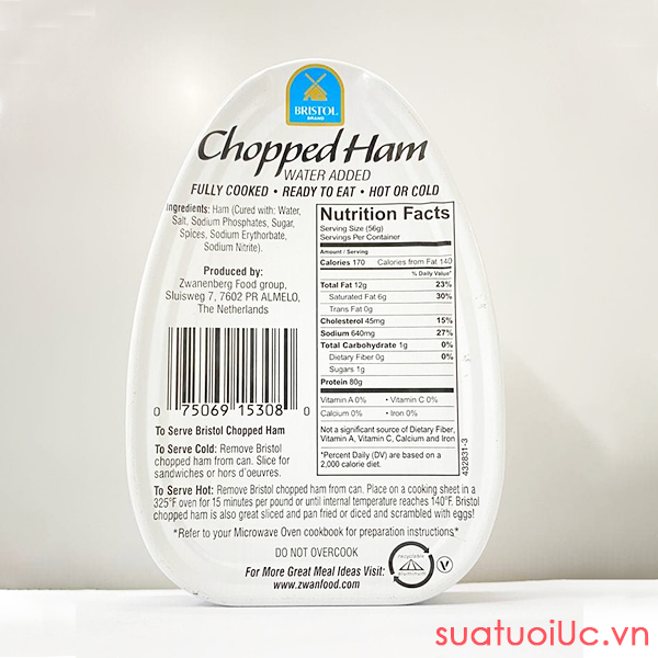 Thịt hộp xắt nhỏ Chopped Ham Bristol 325g là sản phẩm được nhập khẩu chính ngạch từ Mỹ. Chopped Ham Bristol được sản xuất trên dây chuyền hiện đại, đảm bảo giữ nguyên hương vị và giàu chất dinh dưỡng. Sử dụng sản phẩm trong các bữa ăn hàng ngày hoặc trong các chuyến du lịch, dã ngoại rất tiện lợi.